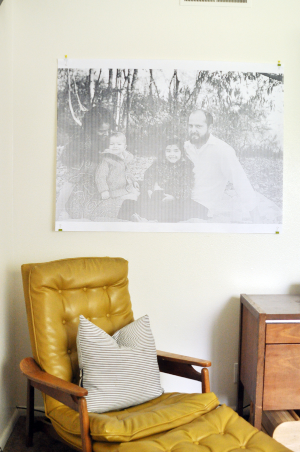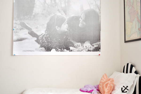Here’s an idea for really really cheap art for your house. I took the digital images from our photo shoot with Amy Clark, to my local blueprint + copy + had the images blown up to about 3×4 feet. Each poster cost about $5 to print + is cheaper for smaller sizes. The images came out black + white + super grainy + I love them.