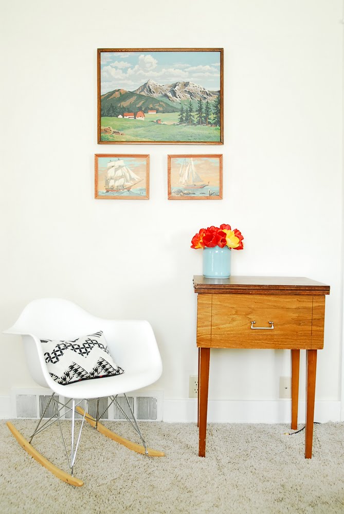 Caitlin ordered the rocker. The side table is actually my 1976 pfaff sewing machine + table. The three paint by numbers are what Caitlin refers to as my ‘collection’.