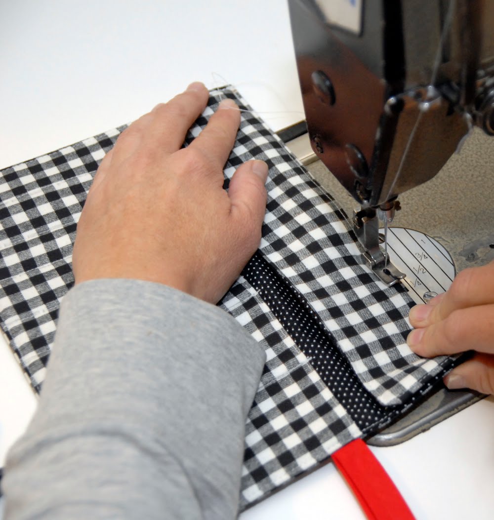 Start with your top piece face up, place your ribbon or bias tape on either side of the top piece about 4 inches from the bottom.